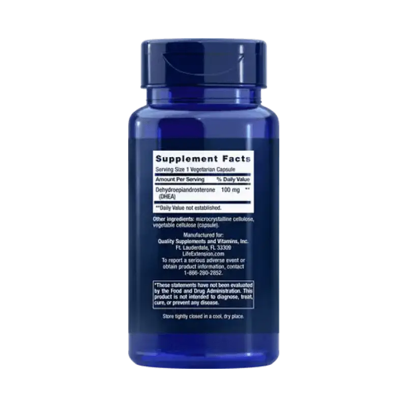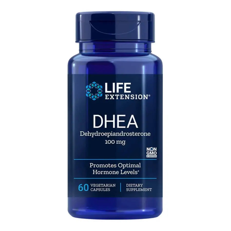 DHEA 100mg Life Extension é um suplemento 100% puro DHEA, hormônio produzido pelas glândulas suprarrenais, no qual é convertido em testosterona nos homens e estrogênio nas mulheres.